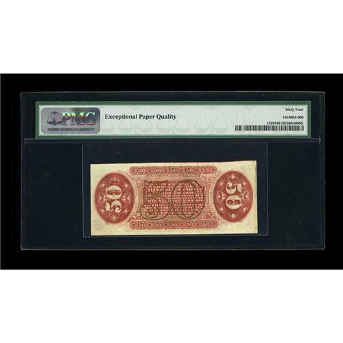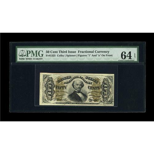 <B>Fr. 1325 50c Third Issue Spinner PMG Choice Uncirculated 64 EPQ.</B></I> A near-Gem example of this "1" and "a" red back Spinner. The margins are broad and with a bit of tightness on the right side, and the note has exceptional color and all its original embossing.<BR><BR><b>Shipping:</b> Coins & Currency (<a target="_blank" href="http://www.heritageauctions.com/common/shipping.php">view shipping information</a>)