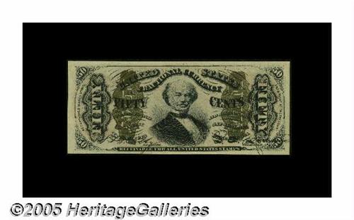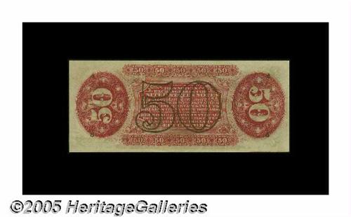 <B>Fr. 1325 Milton 3R50.16a 50¢ Third Issue Spinner Superb Gem New.</B></I> A letter-perfect "1" and "a" Red Back Spinner, with broad, even margins, perfect back centering, flashy bright bronze, brilliant ink color and top-flight eye appeal. CAA has sold five Superb Gem Fr. 1325's (three individual notes, with two repeaters) over the years. This piece is of comparable quality to Lot 193 of our September 2000 Sale, which realized $2,090. Five years later, we anticipate about 50% higher for this beauty. The impression of the edge of the plate is visible in the ultra-wide left margin of the note, as is its curved upper left corner.