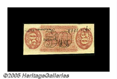 <B>Fr. 1325 Milton 3R50.16d 50¢ Third Issue Spinner Courtesy Autograph About New.</B></I> This scarce "1" and "a" Red Back Spinner bears the large, bold courtesy autograph of A.U. Wyman on the red back along with the date, "April 1883," and "Treasurer US." This tough note with its inverted courtesy autograph has an illustrious history. It was formerly lot 884 of the S.H.&H. Chapman Sale of February 15, 1904. Most all Fractional Courtesy Autographs were signed well after the officials' terms were ended. Wyman served two separate terms as Treasurer. The second began in April 1883, and this note clearly was signed at that time.