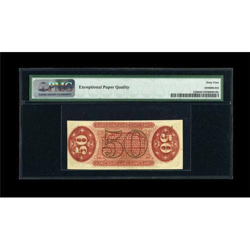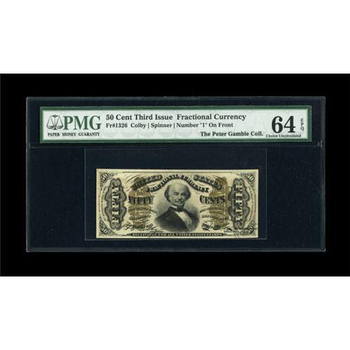 <B>Fr. 1326 50c Third Issue Spinner PMG Choice Uncirculated 64 EPQ.</B></I> Gem sized margins frame this Red Back, "1" on face issue. The embossing remains bold and the paper is bright for the issue.<BR><I>From The Peter Gamble Collection.</B></I><BR><BR><b>Shipping:</b> Coins & Currency (<a target="_blank" href="http://www.heritageauctions.com/common/shipping.php">view shipping information</a>)