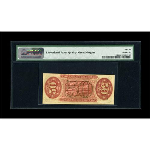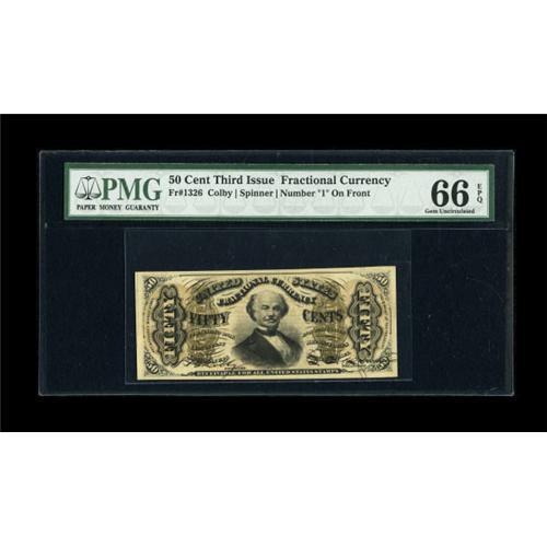 <B>Fr. 1326 50c Third Issue Spinner PMG Gem Uncirculated 66 EPQ.</B></I> Unlike so many examples of this issue, the margins remain sufficiently broad and evenly spaced around the design. The delicate overprint gold FIFTY's are perfectly inked, not so heavy that they lose detail, and not so light they they lack design elements.<BR><BR><b>Shipping:</b> Coins & Currency (<a target="_blank" href="http://www.heritageauctions.com/common/shipping.php">view shipping information</a>)