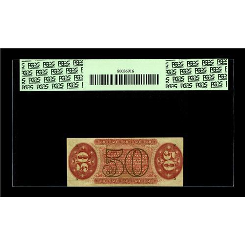 <B>Fr. 1327 50¢ Third Issue Spinner PCGS Choice New 63PPQ.</B></I> Deep original embossing is easily seen on this scarcer number Red Back Spinner. Were the margins a bit broader all around, we would be looking at a real Gem.<BR><I>From The Bill and Kathy Stella Currency Collection</B></I><BR><BR><b>Shipping:</b> Coin/Currency (<a target="_blank" href="http://www.heritageauctions.com/common/shipping.php">view shipping information</a>)