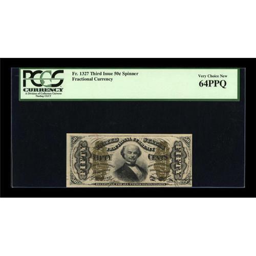 <B>Fr. 1327 50c Third Issue Spinner PCGS Very Choice New 64PPQ.</B></I> Broad margins are noted on three sides of this issue. Perfectly original embossing of the design details is easily visible in the holder.<BR><BR><b>Shipping:</b> Coins & Currency (<a target="_blank" href="http://www.heritageauctions.com/common/shipping.php">view shipping information</a>)