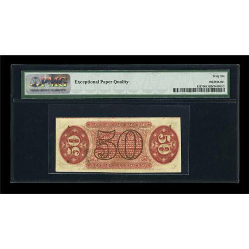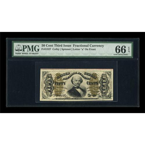 <B>Fr. 1327 50c Third Issue Spinner PMG Gem Uncirculated 66 EPQ.</B></I> Extraordinarily broad margins are noted on this Spinner and are almost perfectly even top to bottom and left to right. Clear embossing is also noted, adding to the overall eye appeal.<BR><BR><b>Shipping:</b> Coins & Currency (<a target="_blank" href="http://www.heritageauctions.com/common/shipping.php">view shipping information</a>)