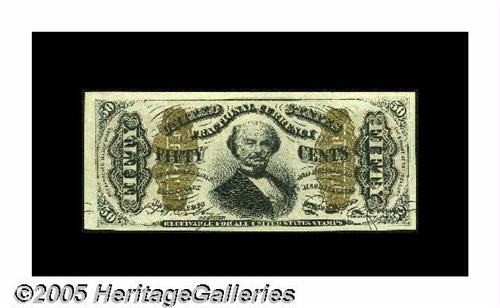 <B>Fr. 1327 Milton 3R50.16c 50¢ Third Issue Spinner Superb Gem New.</B></I> Another essentially flawless Red Back Spinner from this breathtaking collection. The note has the appearance of a piece that was printed earlier today. An incredible statement when one considers the fragile nature of these notes. Virtually any exposure to light over the past 140 years would harm the color. Moisture would darken the bronze, air would age the paper, and pressure would ruin the embossing. Add to that all the misfortunes that could so easily occur to the paper itself. This piece is free of even the tiniest bumps, marks or handling indications. When one considers that for the first 60 or so years of its life, the note's entire value had been its 50¢ redemption, its survival chances in pristine condition were extraordinarily minimal. That a single collector could acquire such a large number of pristine pieces is not just a matter of money (although it helps), but it's a tribute to Tom's good eye, patience and tenacity.