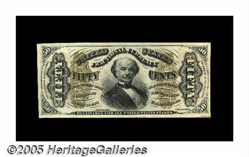 <B>Fr.1328-30 Type 50c Third Issue Spinner Very Choice New.</B></I> An unsigned red back Spinner that Tom acquired out of last May's Stack's Sale for $5,000 in heated bidding competition. To our knowledge, this is the only known example of its type and it was likely a presentation piece rather than an error. It is listed as Milton 3R50.14c based on its appearance in the Wilcox Sale in 1903. Whether that was this piece or another, identical piece is unknown. The colors are perfect and the original embossing is pronounced. The note is a Superb Gem save for its back centering, which just touches the left edge, and an easily removable pencilled, "49c" in the upper left corner of the back. A wonderful item.