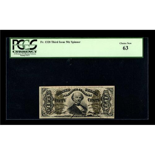 <B>Fr. 1328 50c Third Issue Spinner PCGS Choice New 63.</B></I> Bold signatures and fiery red inks are found on this popular number.<BR><BR><b>Shipping:</b> Coins & Currency (<a target="_blank" href="http://www.heritageauctions.com/common/shipping.php">view shipping information</a>)