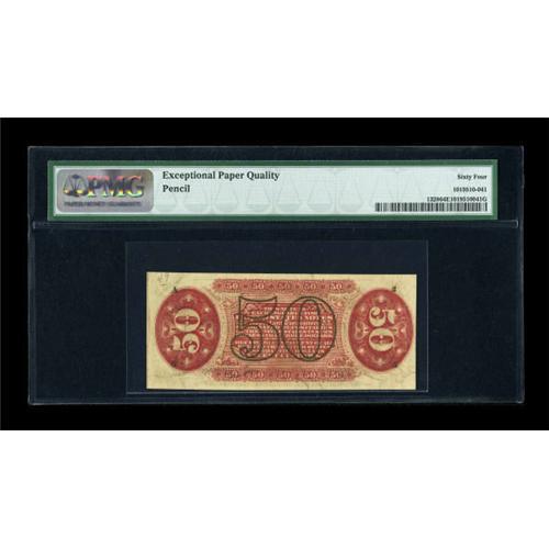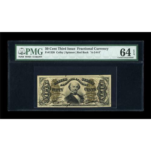 <B>Fr. 1328 50c Third Issue Spinner PMG Choice Uncirculated 64 EPQ.</B></I> The margins certainly look to qualify this bright Red Back Spinner for a higher grade, but perhaps the pencil notation on back is what precluded it. The signatures are strong with great eye appeal.<BR><BR><b>Shipping:</b> Coins & Currency (<a target="_blank" href="http://www.heritageauctions.com/common/shipping.php">view shipping information</a>)
