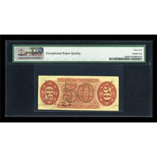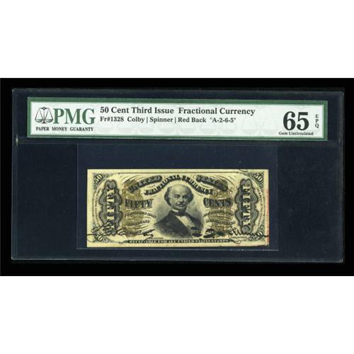 <B>Fr. 1328 50c Third Issue Spinner PMG Gem Uncirculated 65 EPQ.</B></I> "Exceptional Paper Quality" highlights this hand-signed Red Back. The upper right corner on the back shows a partial plate number that, along with obvious originality and terrific margins should make this a popular lot.<BR><BR><b>Shipping:</b> Coins & Currency (<a target="_blank" href="http://www.heritageauctions.com/common/shipping.php">view shipping information</a>)