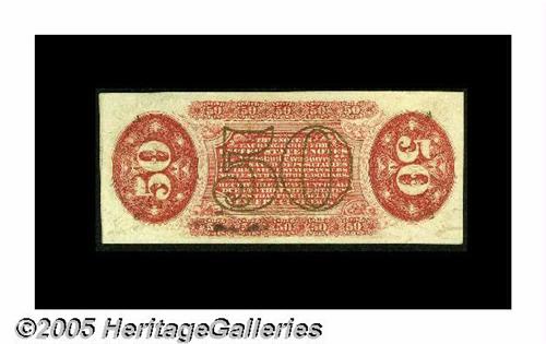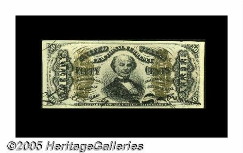 <B>Fr. 1328 Milton 3R50.14 50¢ Third Issue Spinner Superb Gem New.</B></I> A gorgeous note, with broad, even margins, perfect colors, deep, original embossing and large, bold hand signatures. Fr. 1328's are the most common Red Back Spinner in Gem condition. Although we're speculating, it appears as though someone saved a number of these notes at the time of issue, as we've seen many over the years with identical paper, centering, and inking characteristics (for example, the minor weakness at the top of the left-hand bronze.) In any event, this one is about as perfect as a person could ever hope for.
