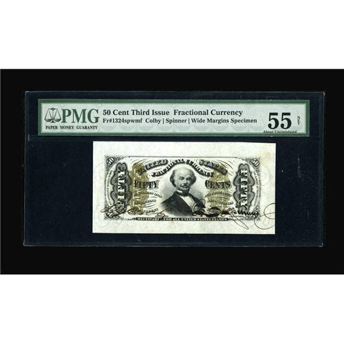 <B>Fr. 1328SP 50¢ Third Issue Spinner Wide Margin Face PMG About Uncirculated 55.</B></I> This hand-signed Spinner is mistakenly called 1324SP on the PMG holder. They seem to have gotten the grade right; they've assigned a "Net 55" grade due to ink burn. This kind of error is re-holdered at no charge, should the buyer care to have it fixed.<BR><BR><b>Shipping:</b> Coins & Currency (<a target="_blank" href="http://www.heritageauctions.com/common/shipping.php">view shipping information</a>)