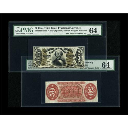 <B>Fr. 1328SP 50c Third Issue Spinner Narrow Margin Pair PMG Choice Uncirculated 64.</B></I> This perfectly matched pair boasts boldly printed details and perfectly penned signatures.<BR><I>From The Peter Gamble Collection.</B></I><BR><BR><b>Shipping:</b> Coins & Currency (<a target="_blank" href="http://www.heritageauctions.com/common/shipping.php">view shipping information</a>)