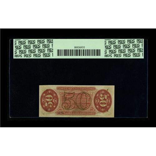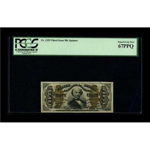 <B>Fr. 1329 50¢ Third Issue Spinner PCGS Superb Gem New 67PPQ.</B></I> This Allison-Spinner signed note has always, in our opinion, been an underrated rarity. This one is a real beauty with broad even margins, deep original embossing, strong signatures and tons of eye appeal. Our consignor has owned this piece for over ten years, having acquired it in our September 1996 "Sale in the Swamp" as Lot 242.<BR><BR><b>Shipping:</b> Coin/Currency (<a target="_blank" href="http://www.heritageauctions.com/common/shipping.php">view shipping information</a>)