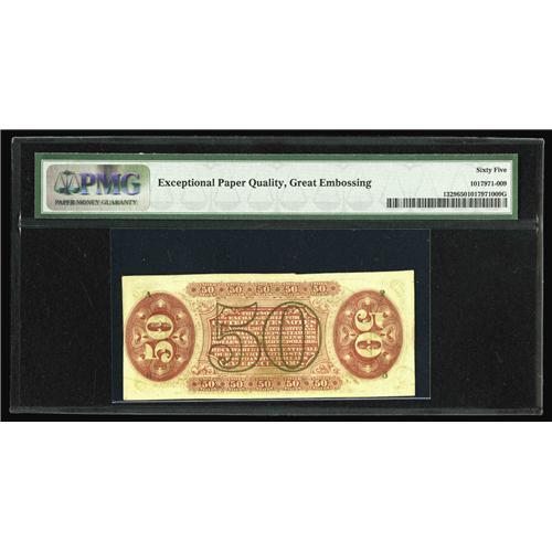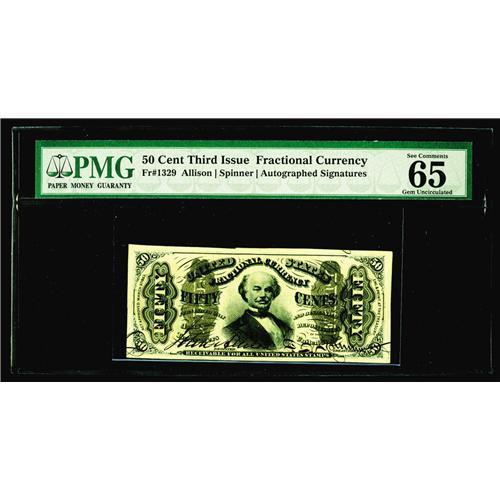 <B>Fr. 1329 50¢ Third Issue Spinner PMG Gem Uncirculated 65.</B></I> Fr. 1329's with their hand-autographs of Allison and Spinner are many times rarer than 1328's, with the Colby signature at the left. They've always been underappreciated notes in our opinion, and this beauty, with its PMG double comment, "Exceptional Paper Quality, Great Embossing," should prove to be a hotly contested item.