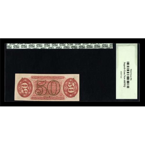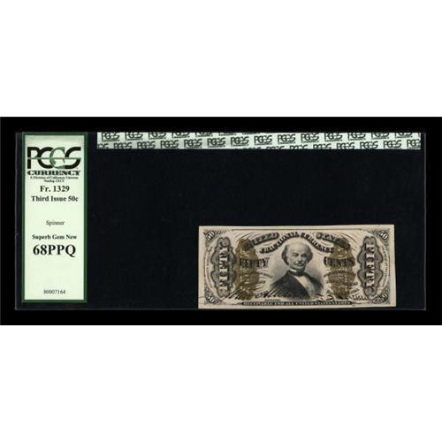 <B>Fr. 1329 50c Third Issue Spinner PCGS Superb Gem New 68PPQ.</B></I> This Allison-Spinner signed note has always, in our opinion, been an underrated rarity. This one is a real beauty with broad even margins, deep original embossing, strong signatures and tons of eye appeal. Not enough superlatives can attest to the beauty this likely condition census note possesses.<BR><BR><b>Shipping:</b> Coins & Currency (<a target="_blank" href="http://www.heritageauctions.com/common/shipping.php">view shipping information</a>)