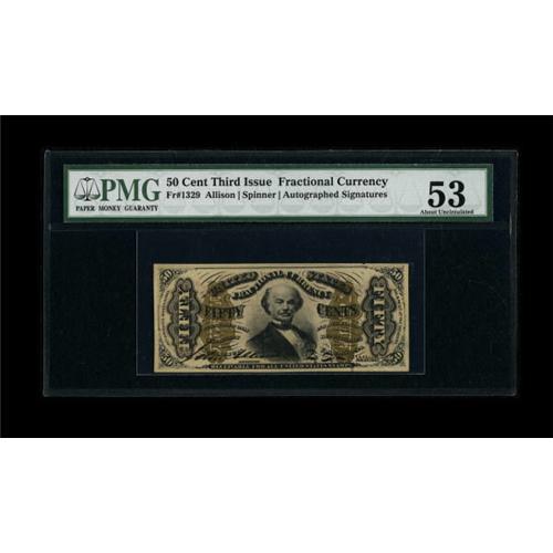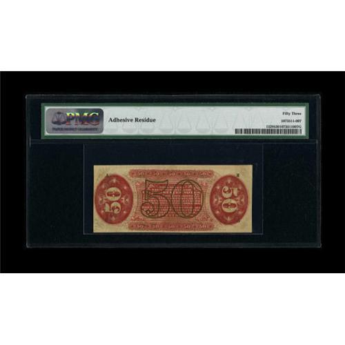 <B>Fr. 1329 50c Third Issue Spinner PMG About Uncirculated 53.</B></I> PMG has commented about some adhesive residue present and there is also the Friedberg number penciled on the back.<BR><BR><b>Shipping:</b> Coins & Currency (<a target="_blank" href="http://www.heritageauctions.com/common/shipping.php">view shipping information</a>)