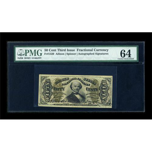 <B>Fr. 1329 50c Third Issue Spinner PMG Choice Uncirculated 64.</B></I> This Allison-Spinner hand-signed note has always, in our opinion, been one of the more underrated Fractional varieties. It's a number that's truly rare in this grade, but it often brings only about double what the far more common Colby-Spinner variety realizes. This disparity between price and rarity likely presents an opportunity for the astute collector. The colors are excellent, and the hand signatures crisp and clear.<BR><BR><b>Shipping:</b> Coins & Currency (<a target="_blank" href="http://www.heritageauctions.com/common/shipping.php">view shipping information</a>)
