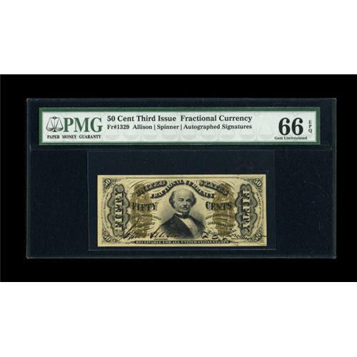 <B>Fr. 1329 50c Third Issue Spinner PMG Gem Uncirculated 66 EPQ.</B></I> This issue features more delicately penned signatures of Allison and Spinner than is usually encountered. The margins are broad for the issue and almost perfectly even on all sides. <BR><BR><b>Shipping:</b> Coins & Currency (<a target="_blank" href="http://www.heritageauctions.com/common/shipping.php">view shipping information</a>)