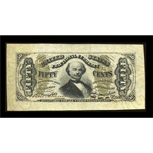 <B>Fr. 1329SP 50¢ Third Issue Wide Margin Face Choice About New. Milton 3P50F.6.</B></I> Only four examples are known of this Allison-Spinner signed Wide Margin Spinner face, all of which grade About New: the Gengerke piece, which we sold as lot 216 in 1995 that realized over $9,000; the Friedberg piece, from our January 1997 Sale; the Stack's May 2004 piece, which realized $10,925; and this ex-O'Mara example. No Collection of Wide Margin Specimens can be considered complete without this number, and this piece is tied (albeit a four-way tie) for finest known. This piece is lightly aged, with a few minor corner folds and three tiny pinholes.
