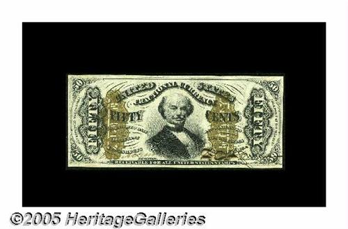 <B>Fr. 1329SP Milton 3S50F.6 50¢ Third Issue Narrow Margin Face Very Choice New.</B></I> An extremely rare specimen with only four or five narrow-margin examples known (and only three wide margins). This note has all of its deep original embossing as well as far better margins than the typical narrow-margin specimens. It would be a perfect Gem were it not for some minor ink cracking in the broad pen strokes of Spinner's signature.