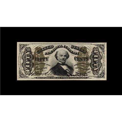 <B>Fr. 1330 50¢ Third Issue Spinner Gem New.</B></I> A stunning example of the extremely rare, hand-signed Allison-New variety. Terrific color on both sides, bright bronze and excellent original paper surfaces. Fr. 1330 is the only opportunity to obtain a hand-signed John New U.S. Currency note. Allison and New were in office from June 30, 1875 until January 7, 1876. These Red Back Spinner notes should have been issued well prior to that. They were clearly not intended as a Regular Issue, but rather were signed to be given to friends or as some form of a patronage act. In any event, they became legal tender when signed, as Allison and New were legal signers. The majority of known 1330's grade CU and higher. No accurate census exists, but the presumed census is in the 20 to 30 range. This cataloger's personal guess is that three sheets of twelve were originally signed, and most of the notes have survived.