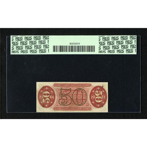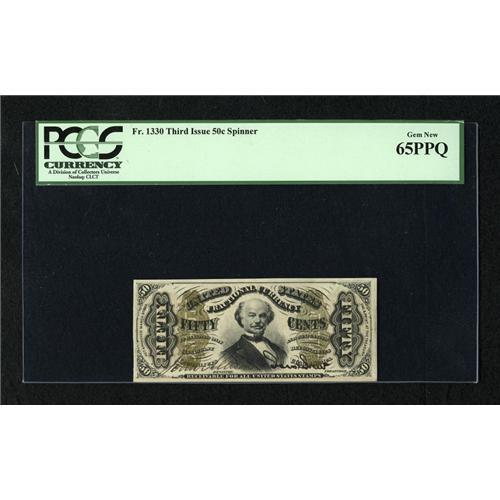 <B>Fr. 1330 50 Third Issue Spinner PCGS Gem New 65PPQ.</B></I> Bill purchased this note from Tom Denly back in the mid-1990s. This rare piece was previously Lot 828 from Stack's sale of the Herman Halpern Collection held on St. Patrick's Day 1993. This gorgeous note is very attractive with bold signatures, deep original embossing, and tremendous eye appeal.<BR><I>From The Bill and Kathy Stella Currency Collection</B></I><BR><BR><b>Shipping:</b> Coins & Currency (<a target="_blank" href="http://www.heritageauctions.com/common/shipping.php">view shipping information</a>)