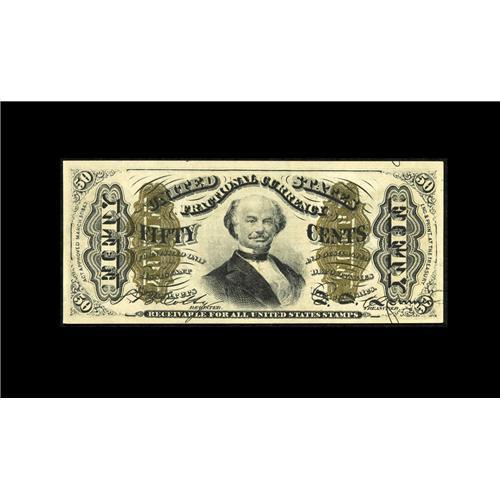 <B>Fr. 1331 50¢ Third Issue Spinner Very Choice New.</B></I> This note, which has all its deep, original embossing, is a perfect Gem when viewed from the face. The back, however, is off center to the right and just touches the edge.