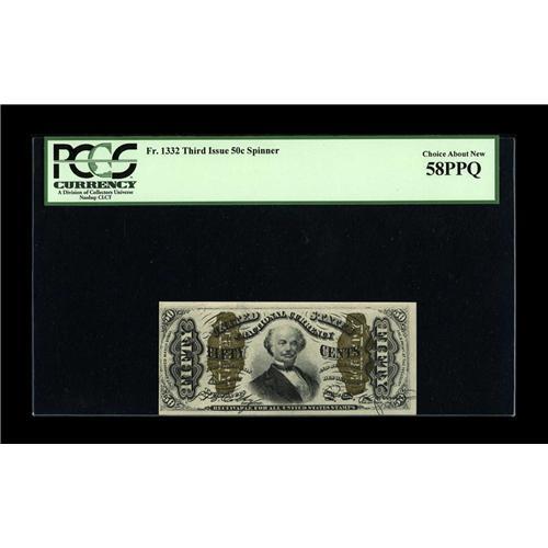 <B>Fr. 1332 50¢ Third Issue Spinner PCGS Choice About New 58PPQ.</B></I> A bit tight at the left end of the face and the right end of the back. But with three huge margins, excellent color, and fresh surfaces.<BR><I>From The Bill and Kathy Stella Currency Collection</B></I><BR><BR><b>Shipping:</b> Coin/Currency (<a target="_blank" href="http://www.heritageauctions.com/common/shipping.php">view shipping information</a>)