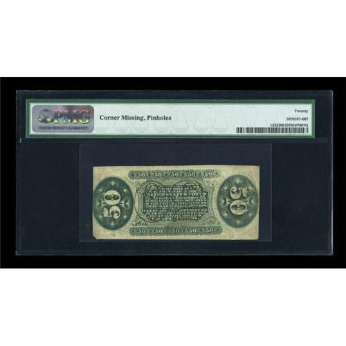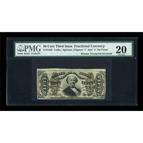 <B>Fr. 1332 50c Third Issue Spinner Inverted Back Surcharge PMG Very Fine 20.</B></I> Previously lot 819 of our 1997 sale of the Milt Friedberg Collection. Prior to that, it was lot 502 of the Siegel Lilly Collection in 1969. In 1997, we described it as: "Very Fine, two tiny corner tips are missing from this very rare '1' and 'a' invert. Three pieces were known when the encyclopedia was published in the late 70s, and to our best knowledge no others have appeared in the intervening years." PMG has now graded it VF 20 with the comment "Corner Missing, Pinholes". To this date, we know of no others and believe the census to still be three.<BR><BR><b>Shipping:</b> Coins & Currency (<a target="_blank" href="http://www.heritageauctions.com/common/shipping.php">view shipping information</a>)