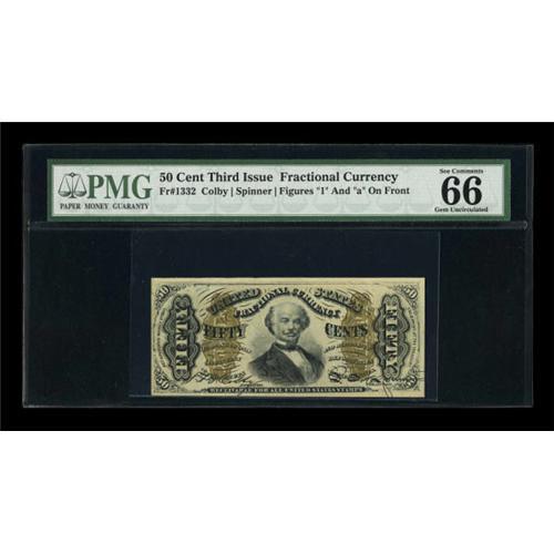 <B>Fr. 1332 50c Third Issue Spinner PMG Gem Uncirculated 66 EPQ.</B></I> The paper is especially bright for the issue and is far above average for the "1" and "a" variety. The golden overprint remains perfect and free of aging.<BR><BR><b>Shipping:</b> Coins & Currency (<a target="_blank" href="http://www.heritageauctions.com/common/shipping.php">view shipping information</a>)