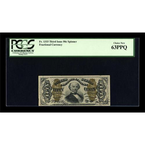 <B>Fr. 1333 50c Third Issue Spinner PCGS Choice New 63PPQ.</B></I> The usual broad margins are present on this strongly embossed Spinner.<BR><BR><b>Shipping:</b> Coins & Currency (<a target="_blank" href="http://www.heritageauctions.com/common/shipping.php">view shipping information</a>)