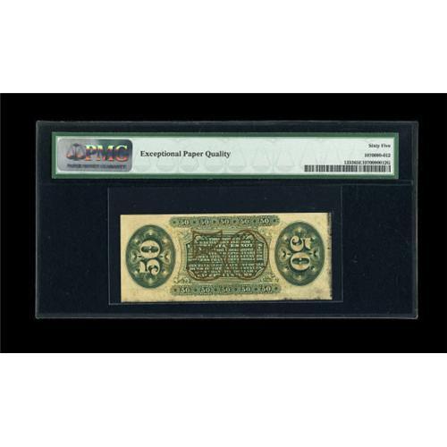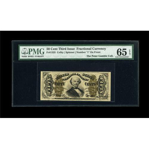<B>Fr. 1333 50c Third Issue Spinner PMG Gem Uncirculated 65 EPQ.</B></I> Typical face centering is noted with broad margins on three of four sides. The top margin is ample for a Gem grade, though a touch smaller than the bottom. Embossing of most of the devices on the face is visible in the open fields of the back.<BR><I>From The Peter Gamble Collection.</B></I><BR><BR><b>Shipping:</b> Coins & Currency (<a target="_blank" href="http://www.heritageauctions.com/common/shipping.php">view shipping information</a>)