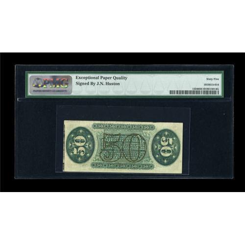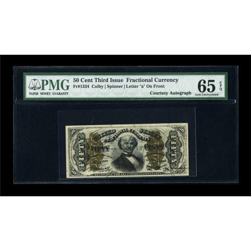 <B>Fr. 1334 50c Third Issue Spinner Courtesy Autograph PMG Gem Uncirculated 65 EPQ.</B></I> J.N. Huston is a name that is not normally seen as a courtesy signer. Well margined and bright, with the autograph clearly visible and strong.<BR><BR><b>Shipping:</b> Coins & Currency (<a target="_blank" href="http://www.heritageauctions.com/common/shipping.php">view shipping information</a>)