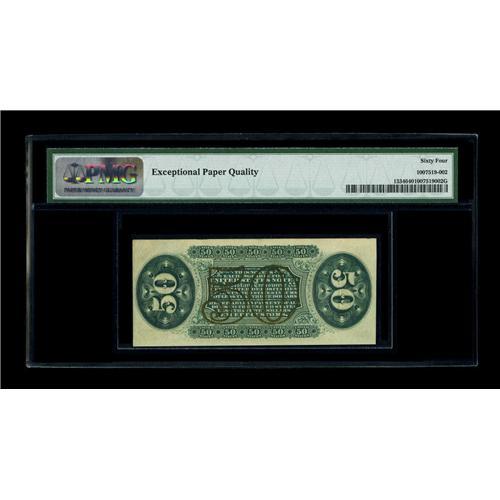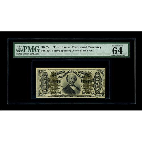 <B>Fr. 1334 50c Third Issue Spinner PMG Choice Uncirculated 64 EPQ.</B></I> Three enormous margins and an adequate fourth highlight this tougher Spinner number with "a" on face. The bronzing is bright and the ink colors lovely in every regard. The embossing on this note is a textbook example of what original paper surfaces look like.<BR><BR><b>Shipping:</b> Coin/Currency (<a target="_blank" href="http://www.heritageauctions.com/common/shipping.php">view shipping information</a>)