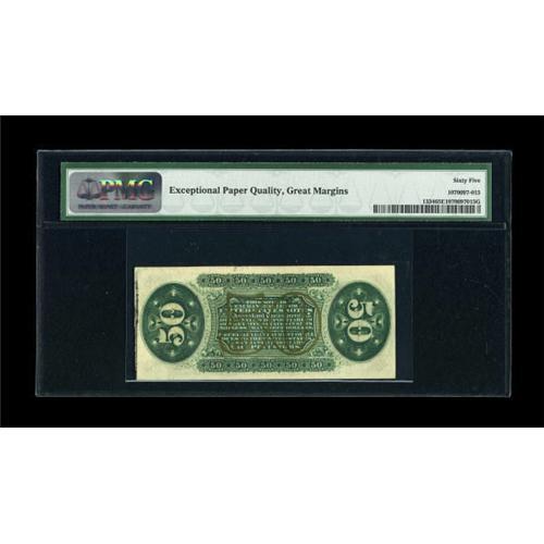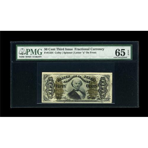 <B>Fr. 1334 50c Third Issue Spinner PMG Gem Uncirculated 65 EPQ.</B></I> Waviness of the paper is noted in the holder as is solid embossing of the design elements. The face margins are as large as one will find on a Spinner and the paper remains bright.<BR><BR><b>Shipping:</b> Coins & Currency (<a target="_blank" href="http://www.heritageauctions.com/common/shipping.php">view shipping information</a>)