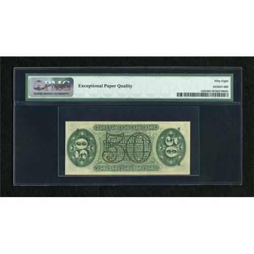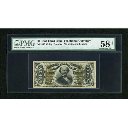 <B>Fr. 1335 50c Third Issue Spinner PMG Choice About Unc 58 EPQ.</B></I> A nice example of this much scarcer Friedberg number. The note is well margined with plenty of embossing present. A difficult number to find.<BR><BR><b>Shipping:</b> Coins & Currency (<a target="_blank" href="http://www.heritageauctions.com/common/shipping.php">view shipping information</a>)