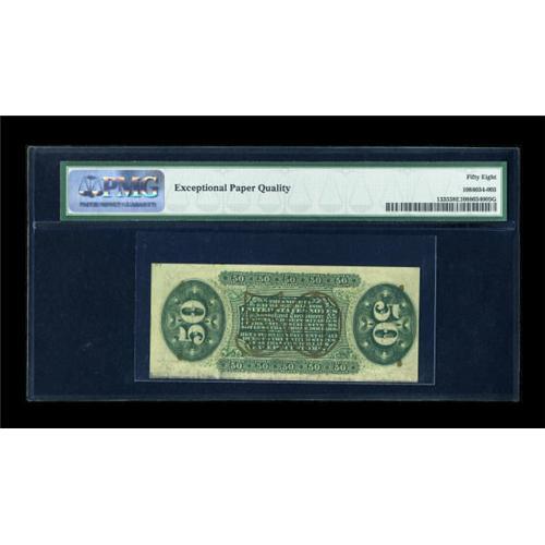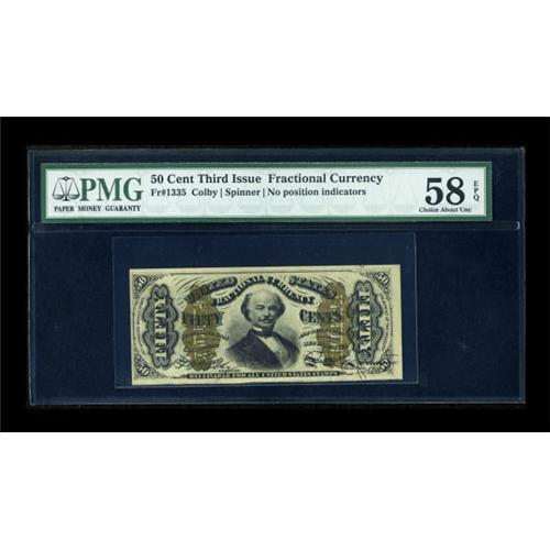 <B>Fr. 1335 50c Third Issue Spinner PMG Choice About Unc 58 EPQ.</B></I> This is the scarcer Green Back Spinner series with the A-2-6-5 reverse surcharges. This handsome AU has been awarded PMG's "Exceptional Paper Quality" accolade.<BR><BR><b>Shipping:</b> Coins & Currency (<a target="_blank" href="http://www.heritageauctions.com/common/shipping.php">view shipping information</a>)