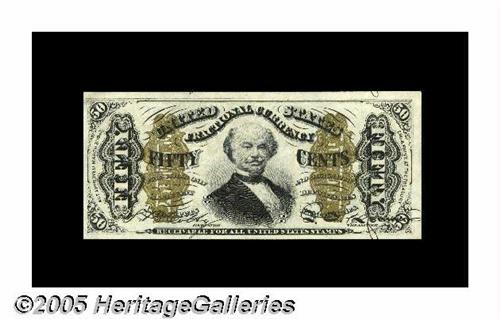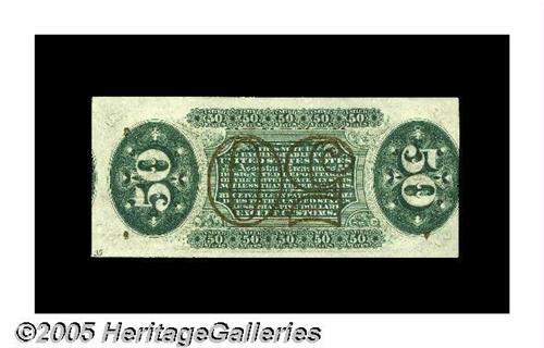 <B>Fr. 1335 Milton 3R50.20d 50¢ Third Issue Spinner Inverted Back Surcharge Very Choice New.</B></I> This rare Invert is a pure Gem when viewed from the face. It's incredibly fresh and original with deep embossing apparent. The bronze is reflectively bright, the paper pure white and the jet-black inking razor sharp. The only defect this note has is that the back centering is shifted to the right. This is a mixed blessing, as it clearly takes the note out of the Gem category, but on the other hand it allows the entire back-plate number 35 to fall squarely in the lower left-hand corner. At the time of the printing of the Encyclopedia (where this note is plated on both sides), Milt knew of only one other example; the current census, we believe, is four. Milt had a large number of very rare inverts, and a fair number of extraordinary condition inverts. Both met on this great note. This note realized $1,320 at the Friedberg Sale eight years ago, and it should fly right by that now.