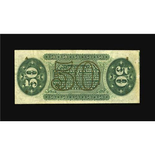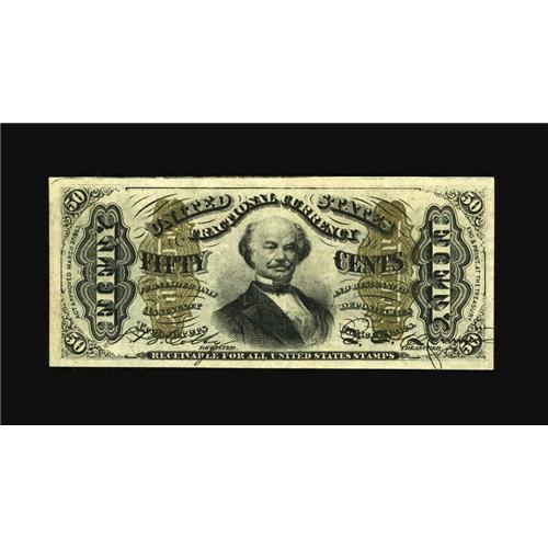 <B>Fr. 1336 50¢ Third Issue Spinner About New.</B></I> This is a truly rare number that seldom appears for sale in any grade. CAA has offered Fr. 1336 twenty-one times in our 40+ sales, but when repeats are removed, this accounts for fewer than ten different notes. It's our belief that only about 20 examples exist for this number in all grades combined. This piece is firmly ensconced in the top half of the census for technical grade, and far higher than that for eye appeal. It's extremely well margined on both sides, beautifully printed all the way out to the frame line, and strictly original with its pronounced embossing plainly evident. We would anticipate this pretty piece to realize in excess of. . .<BR><I>From The Bill and Kathy Stella Currency Collection</B></I><BR><BR><b>Shipping:</b> Coin/Currency (<a target="_blank" href="http://www.heritageauctions.com/common/shipping.php">view shipping information</a>)