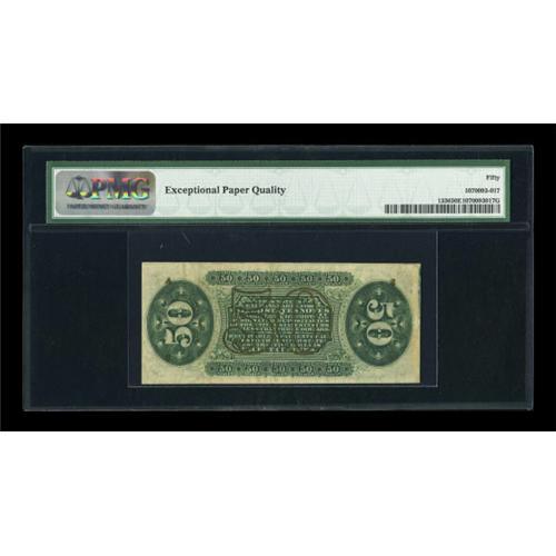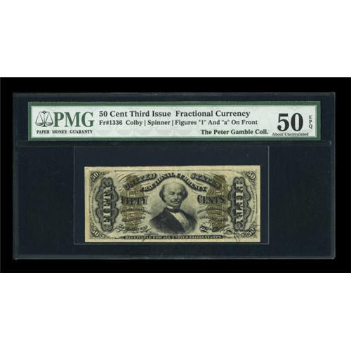 <B>Fr. 1336 50¢ Third Issue Spinner PMG About Uncirculated 50 EPQ.</B></I> One of the very rarest of the Spinner notes with perhaps two dozen survivors in all grades combined. PMG has graded only four with this piece in the middle for grade. The margins are huge and the print quality is excellent allowing both the "1" and "a" to be clearly seen. <BR><I>From The Peter Gamble Collection.</B></I><BR><BR><b>Shipping:</b> Coins & Currency (<a target="_blank" href="http://www.heritageauctions.com/common/shipping.php">view shipping information</a>)