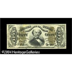 Fr. 1336 50c Third Issue Spinner Choice About New. Ther <B>Fr. 1336 50c Third Issue Spinner Choice About New.</B></I> There is some light pressbed smudging, which is typical for these "1" and "a" notes, but that and a few light handling marks are more than made up for by this very rare note's deep embossing and perfect paper originality. Only about 25 or so Fr. 1336s are known, and this is one of the very nicest. <BR><BR><B>Important notice:</B> Heritage usually auctions material at the rate of 200-250 lots per hour. On some occasions eBay Live bid software or the Internet may not be able to keep up with the pace of the auction. We recommend placing a realistic absentee bid now as insurance to avoid disappointment. Occasionally the auctioneer may eliminate or reject an eBay Live bid, and the auctioneer may also reopen a lot after the close of the eBay live bidding (usually because we missed an audience bid), and may reject your bid even if it shows you as the winning bidder. By bidding via eBay Live, you agree that Heritage may award the lot to another bidder at its sole discretion under the circumstances described above or any other reasonable circumstances. Since eBay bids are not shown to us until we open the lot on the floor, we treat those bids just like floor bids. In most cases the floor responds before the eBay bid is presented to us, due to Internet lag time, so for consistency we have made it a policy that floor bids are always considered first over tie eBay live bids. Also please note that all Heritage lots purchased through eBay Live carry a 20% Buyer's Premium. Please make sure you read the Terms and Conditions before you bid. This lot is being auctioned in conjunction with a live floor auction by Heritage Galleries & Auctioneers. All final auction and invoice information will be supplied by Heritage Galleries & Auctioneers, and all other information should be considered preliminary. Lot:15434