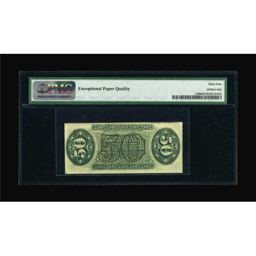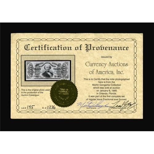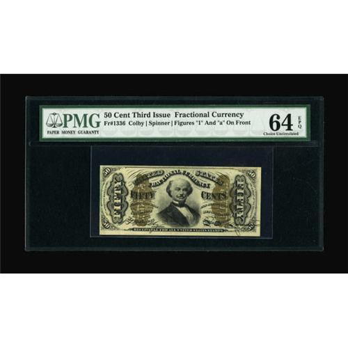 <B>Fr. 1336 50c Third Issue Spinner PMG Choice Uncirculated 64 EPQ.</B></I> Martin Gengerke purchased this note in 1973 from Lester Merkin. CAA's offering of the note in January of 1995 included the following description, "A classic rarity missing from many major collections. Deep original embossing and superb printing quality on both sides. There is a minor ink smear in the somewhat narrow left face margin and another at the top of the back. The four Green Back Spinners with the "A-2-6-5" surcharge are a very rare series, and this "1" and "a" note appears as only one of 12 from the sheet. Seldom available in any grade, it is not likely that the opportunity to improve on this note will appear any time soon." Accompanying this solidly margined near-Gem is a "Certification of Provenance" from the Martin Gengerke Collection. The note is wholly original and features a partial plate number on back.<BR><BR><b>Shipping:</b> Coins & Currency (<a target="_blank" href="http://www.heritageauctions.com/common/shipping.php">view shipping information</a>)