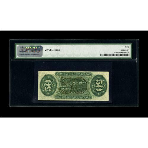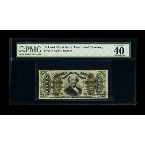 <B>Fr. 1336 50c Third Issue Spinner PMG Extremely Fine 40.</B></I> A very pleasing example of this rare variety which numbers a couple dozen notes or so. The paper is fresh and bright with strong color and, as PMG comments, vivid details. There is some very light pressbed smearing along the top and the left margins which is very typical of these "1" and "a" notes. Scarce varieties such as this one always bring strong money in major auction formats.<BR><BR><b>Shipping:</b> Coin/Currency (<a target="_blank" href="http://www.heritageauctions.com/common/shipping.php">view shipping information</a>)
