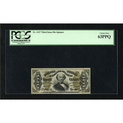 <B>Fr. 1337 50c Third Issue Spinner PCGS Choice New 63PPQ.</B></I> A much tougher Friedberg number, and a very handsome example with good margins and easily visible original embossing.<BR><BR><I>From The Bill and Kathy Stella Currency Collection</B></I><BR><BR><b>Shipping:</b> Coins & Currency (<a target="_blank" href="http://www.heritageauctions.com/common/shipping.php">view shipping information</a>)