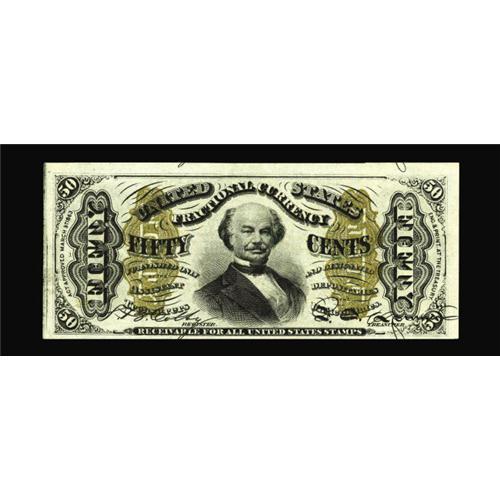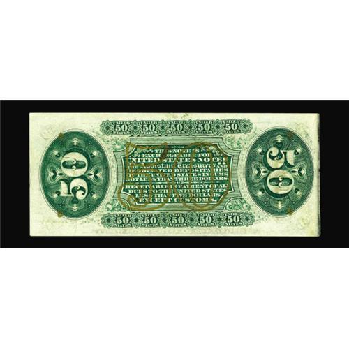 <B>Fr. 1337 50c Third Issue Spinner Gem New.</B></I> Here is a nice example of this really scarce Spinner Friedberg number. The face has three extra large margins and an adequate fourth margin to support the grade. The paper surfaces are also crisp and fresh with a bright bronze overprint and bold print quality. Not surprising since this example was acquired from Fractional Currency Inc. over 25 years ago.