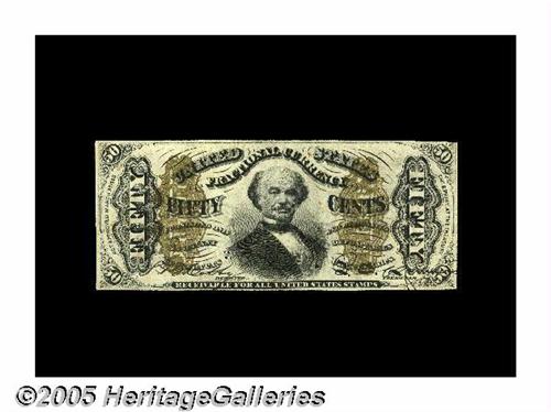 <B>Fr. 1338 Milton 3R50.20g 50¢ Third Issue Inverted Back Surcharge About New.</B></I> This Invert represents a nice meeting of both extreme rarity and high grade. We know of the existence of only one other example of this number, with this piece being the finer of the two. Fr. 1338 is a difficult number to locate in any grade, as even a normal note, and the availability of the finer of only two known Inverts is a significant occasion for Fractional specialists. This piece is bright, strictly original, with reflective bronze and sharp printing quality. As the Friedberg specimen eight years ago, it realized $990.