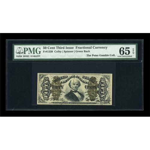 <B>Fr. 1339 50¢ Third Issue Spinner Type II PMG Gem Uncirculated 65 EPQ.</B></I> A decent Type II Spinner in a high-end holder.<BR><I>From The Peter Gamble Collection.</B></I><BR><BR><b>Shipping:</b> Coins & Currency (<a target="_blank" href="http://www.heritageauctions.com/common/shipping.php">view shipping information</a>)