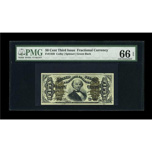<B>Fr. 1339 50c Third Issue Spinner Type II PMG Gem Uncirculated 66 EPQ.</B></I> Unlike many so-called Gems, this exceptional piece boasts broad margins and near perfect front to back centering.<BR><BR><b>Shipping:</b> Coins & Currency (<a target="_blank" href="http://www.heritageauctions.com/common/shipping.php">view shipping information</a>)