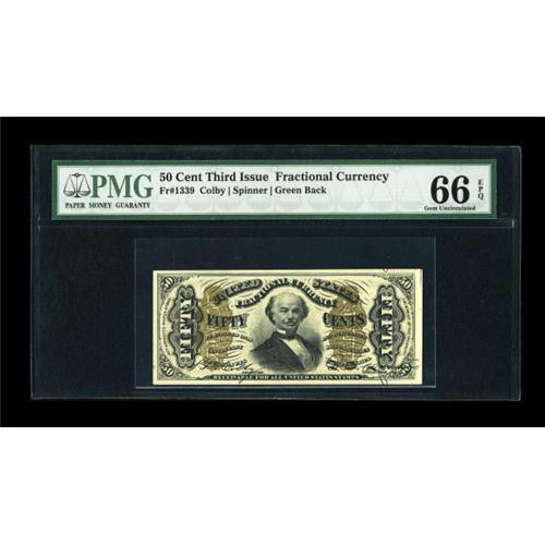 <B>Fr. 1339 50c Third Issue Spinner Type II PMG Gem Uncirculated 66 EPQ.</B></I> Here is another opportunity to acquire a note not often seen at this lofty grade level. Well margined, maintaining plenty of eye appeal.<BR><BR><b>Shipping:</b> Coins & Currency (<a target="_blank" href="http://www.heritageauctions.com/common/shipping.php">view shipping information</a>)