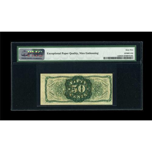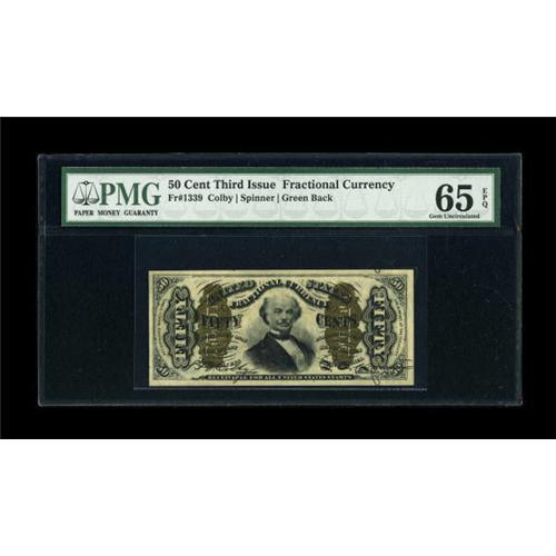 <B>Fr. 1339 50c Third Issue Spinner Type II PMG Gem Uncirculated 65 EPQ.</B></I> Solid face margins are noted, though the back design is centered a touch to the right. All of the design elements are boldly printed.<BR><BR><b>Shipping:</b> Coins & Currency (<a target="_blank" href="http://www.heritageauctions.com/common/shipping.php">view shipping information</a>)